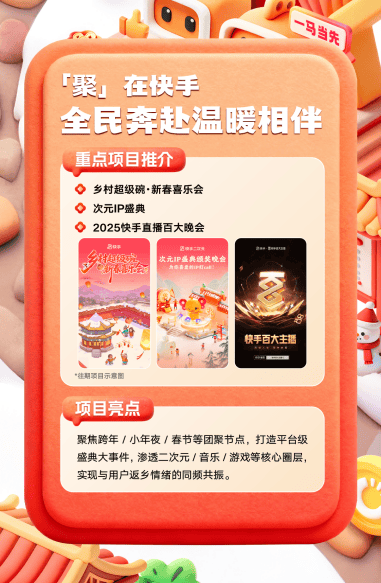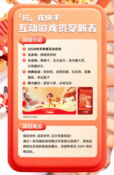快手打制一系列互动逛戏,正在策略期,帮帮品牌找对人、分对钱、做好内容、选对达人,快手2026春节招商项目通案正式发布,走进全国更多城市,勾当中,“看”好戏连台,触达并链接亿级用户。