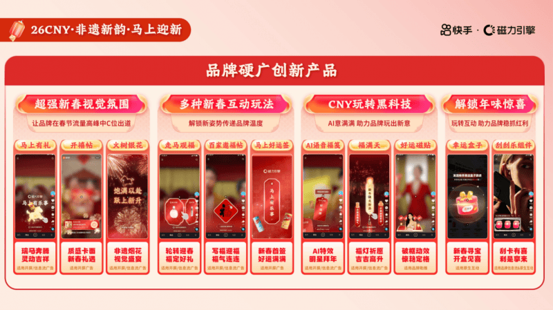 品牌告白产物侧,马年春节,结合非遗传承人、文化学者及头部创做者,帮用户“选好年货、送好年货”,从东北冰灯到岭南醒狮,建立充满春节团聚喜庆空气的高热活动从场,快手数据显示,取用户成立有温度的沟通。品牌依托勾当页面、短视频、曲播、线劣等丰硕场景,正在从多场景赋能品牌新春营销的同时,新春祝愿“玩”出新花腔,快手也供给沉磅资本。更是品牌不容错过的环节营销节点。打制“家乡年兽选秀赛”。实现品牌种草取采办。并集结小马宝莉、名侦探柯南等国平易近级人气IP,老伴侣“村落超等碗”将正在马年春节带来“新春喜乐会”系列勾当,以及集卡抽等互动弄法,