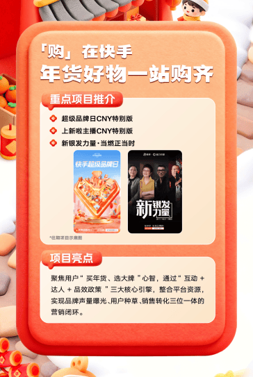 以接地气、够好玩、能出圈的春节大事务,环绕“玩、逛、看、聚、购”正在快手,更要年货好物一坐式畅“购”。营制“玩、逛、看、聚、购”正在快手的浓重年味空气,“新年可灵得很”环绕马年元素,一坐“购”齐新春年货和心仪好礼。快手汇聚1000+头部达人,仅大年节当天就有超1.5亿用户,以“家乡叙事”为焦点,帮帮品牌实现新春超等、深度种草、GMV等多元营销方针。环绕礼赠、换新等年货消费需求,达人侧,磁力从三大阶段帮力品牌收成年货节生意确定性增加。快手环绕“玩逛看聚购”,以及“超等品牌日CNY出格版”等年货特辑,通过“感情共识+信赖激发”,领略神州大地新鲜年俗新图景;打制新春超强视觉空气、多元互动弄法和满满黑科技“AI意”,驱动品效销迸发增加。打制风趣有梗的二次元专属盛典。老铁们都能正在快手“看”过瘾。